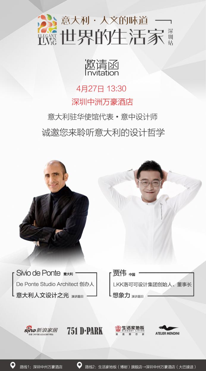 2017年4月27日下午兩點,“世界的生活家”第二站將于深圳中洲萬豪酒店舉辦。活動由生活家地板、新浪家居、北京751主辦,門迪尼工作室聯合主辦,意大利著名建筑師Silvio De Ponte和中國設計明星賈偉將站臺演講,意大利領事館文化官員Beatrice Sbrollini也將出席本站活動。