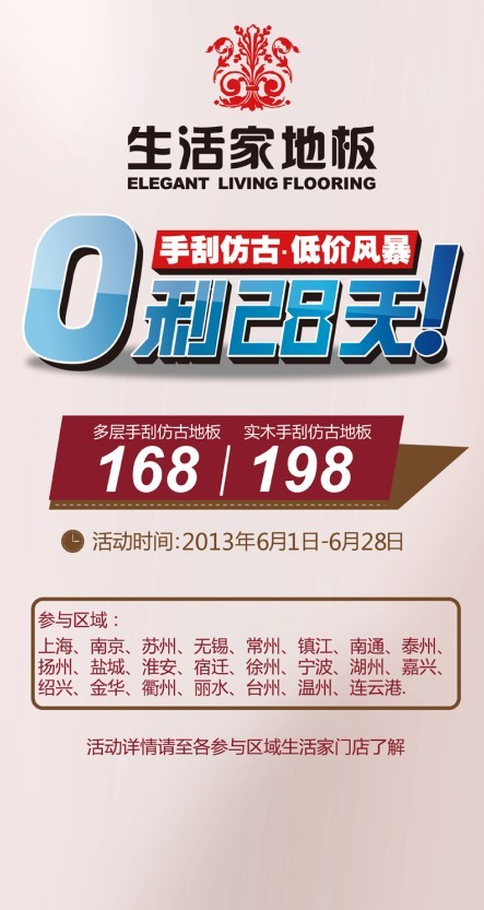 活動主題:0利28天 手刮仿古低價風暴 活動時間:2013年6月1日-6月28日 參與區(qū)域:上海、南京、蘇州、無錫、常州、鎮(zhèn)江、南通、泰州、揚州、鹽城、淮安、宿遷、連云港、徐州、寧波、湖州、嘉興、紹興、金華、衢州、麗水、臺州、溫州